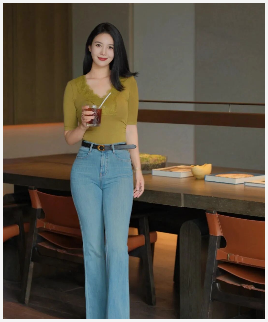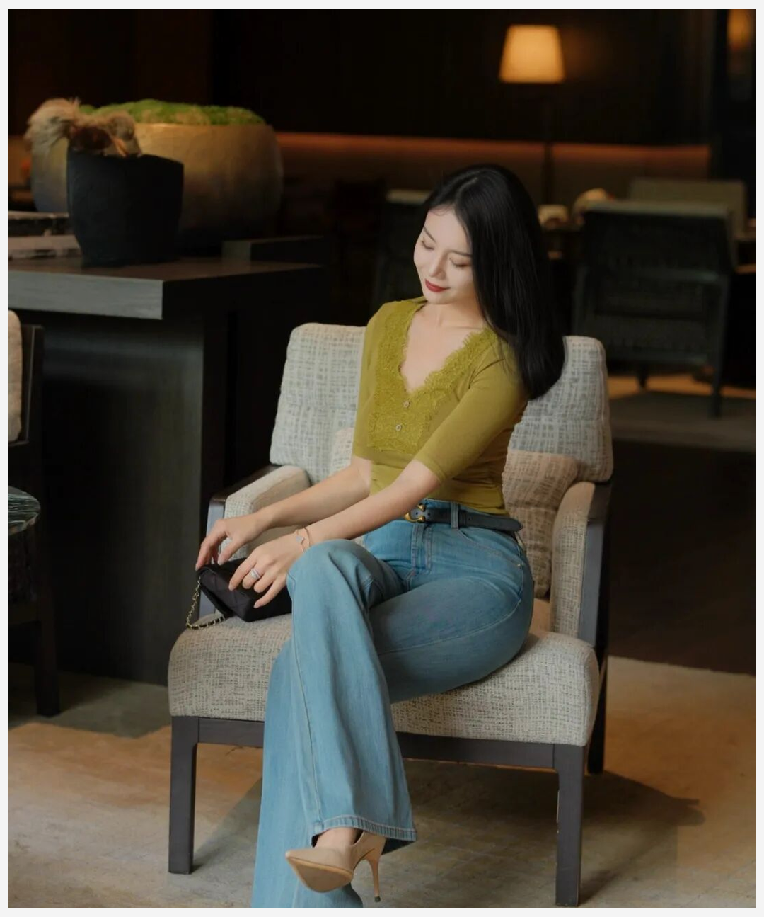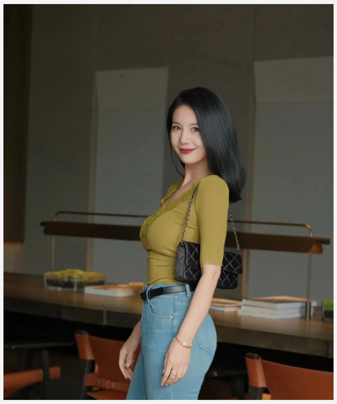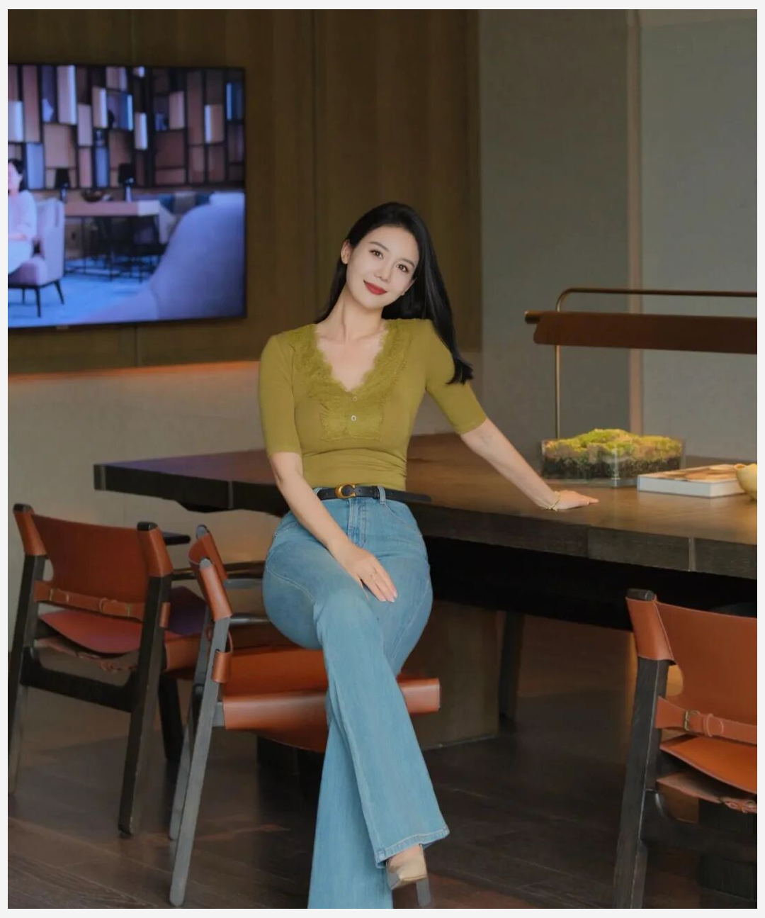 如果场地里有高脚椅或靠近桌边的座位,这个动作一定要试。她一手轻扶桌面,一手自然落在腿上,身体坐直但不过分挺,双腿交叠后,整个人会显得更修长。尤其喇叭裤或微阔裤型,在坐姿里非常占优势,既能拉腿长,又能让坐姿看起来更从容。