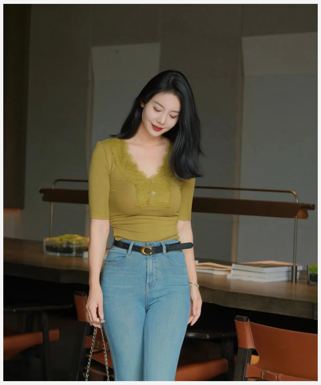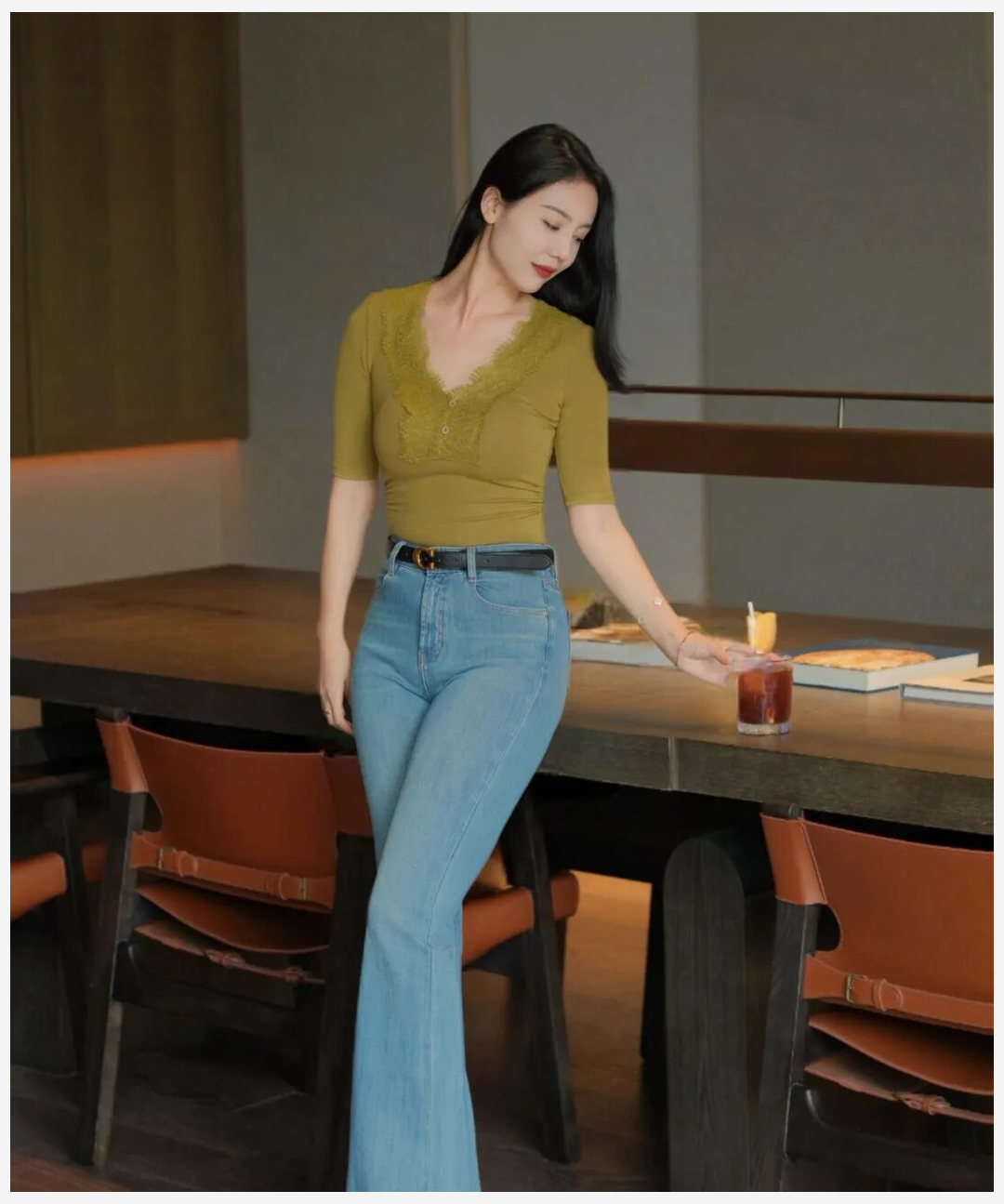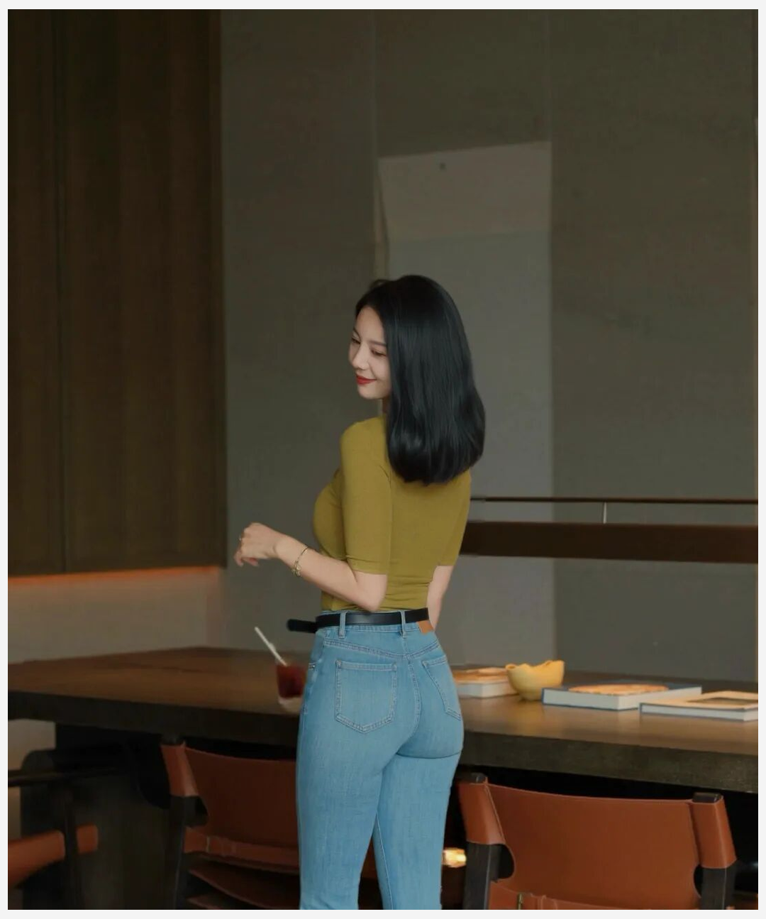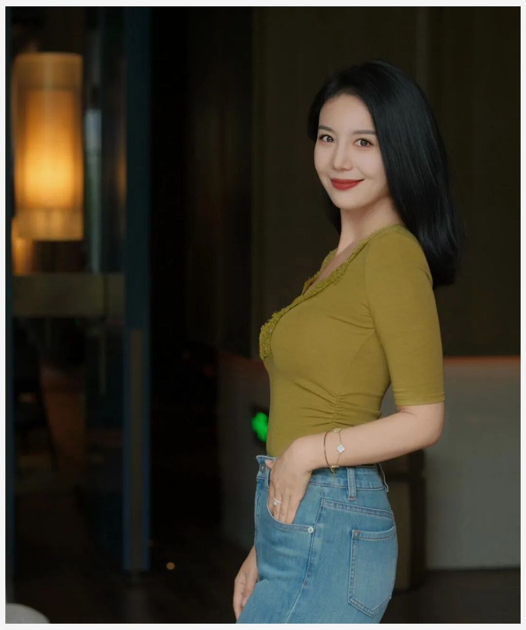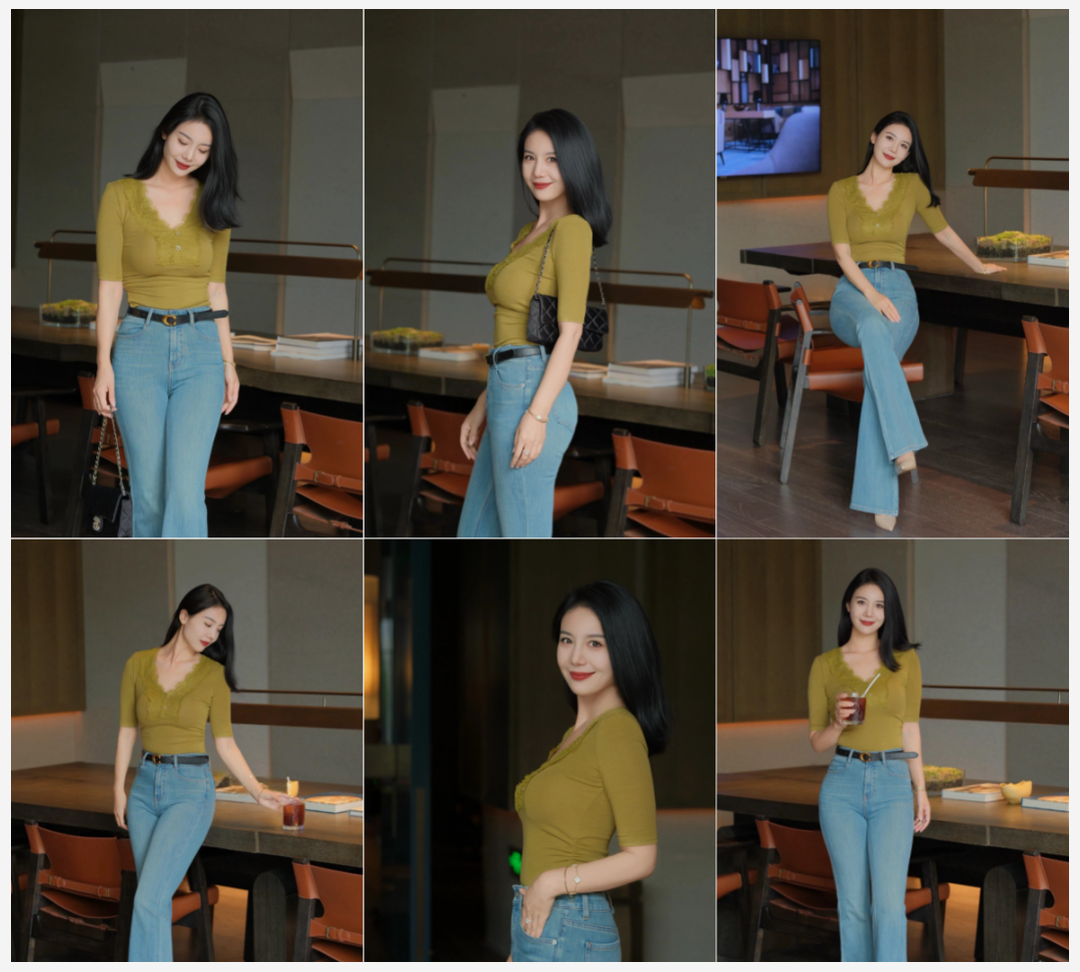 如果场地里有高脚椅或靠近桌边的座位,这个动作一定要试。她一手轻扶桌面,一手自然落在腿上,身体坐直但不过分挺,双腿交叠后,整个人会显得更修长。尤其喇叭裤或微阔裤型,在坐姿里非常占优势,既能拉腿长,又能让坐姿看起来更从容。